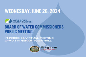 The Weir River Water System Board of Water Commissioners will meet on Wednesday, June 26 at 2PM. Their agenda includes an update on the WRWS water quality and a review of recent events. The meeting is open to the public and will be held at Hingham Town Hall and remotely via Zoom. For more information, please read the latest WRWS update.